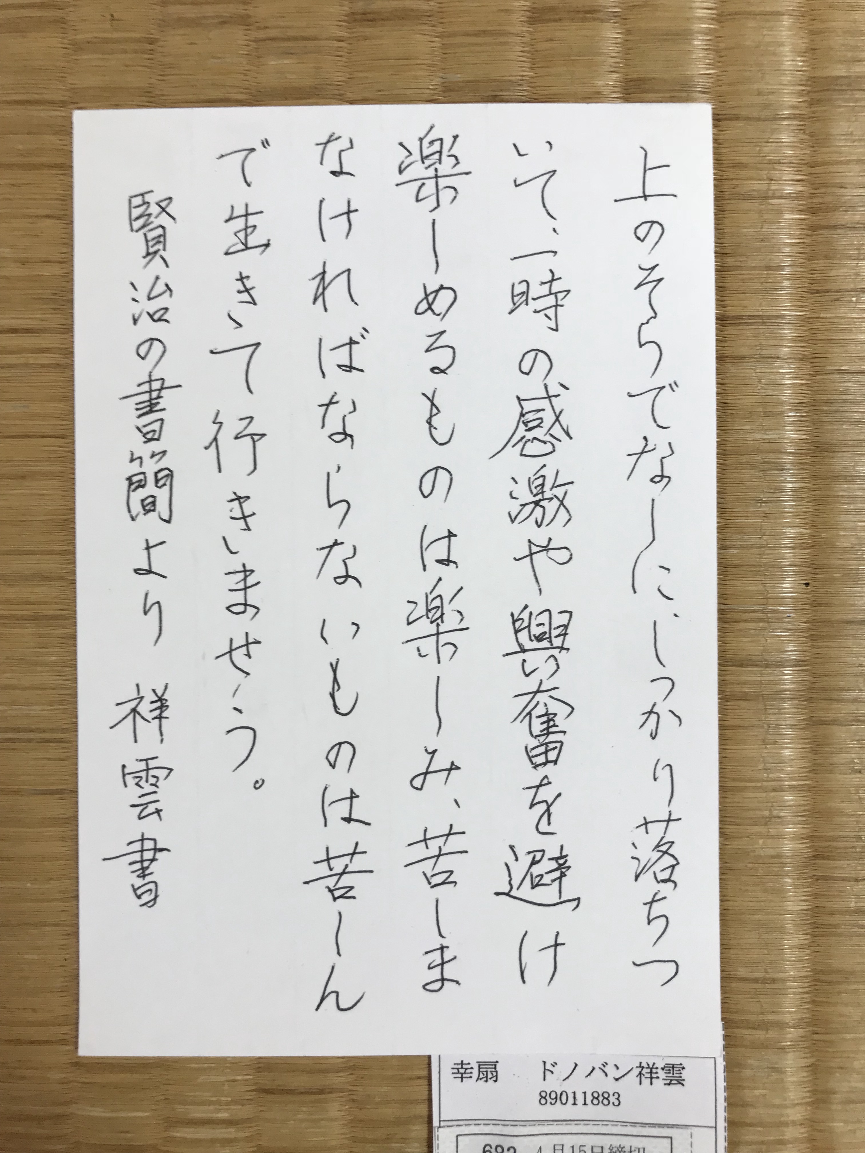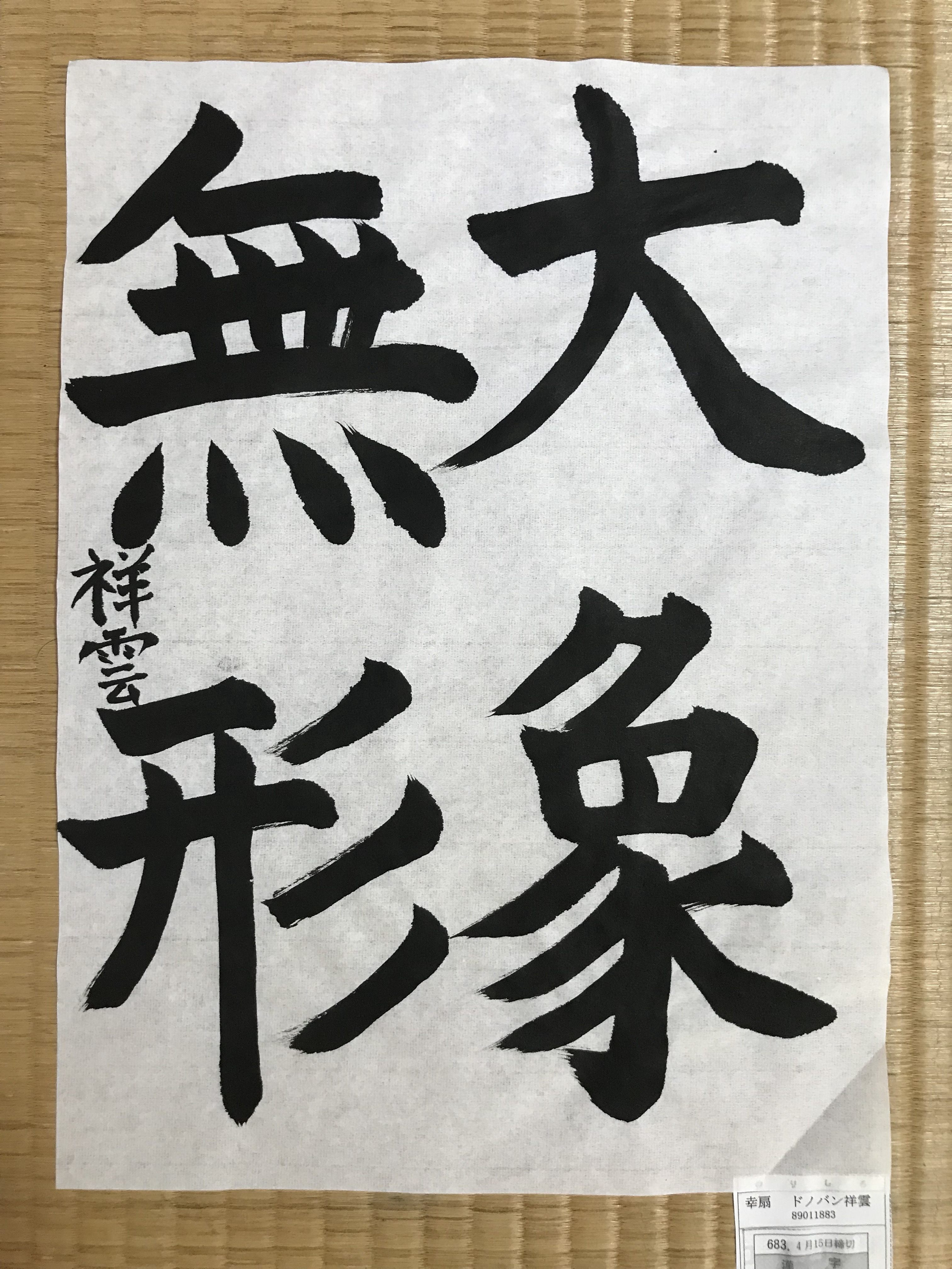 Kana is my best area. It flows and connects from one word to the next. I find it the most artistic. My Sensei tells me that as I reach these higher ranks, it’ll be harder to level up. Once you get the basics, the differentiator is not skill in the shape of the words, but in the space between them, and the amount of ink on your brush. If you look below, the amount of ink is about the same throughout the work. That’s apparently not good, and what I need to work on to get to the next level.
