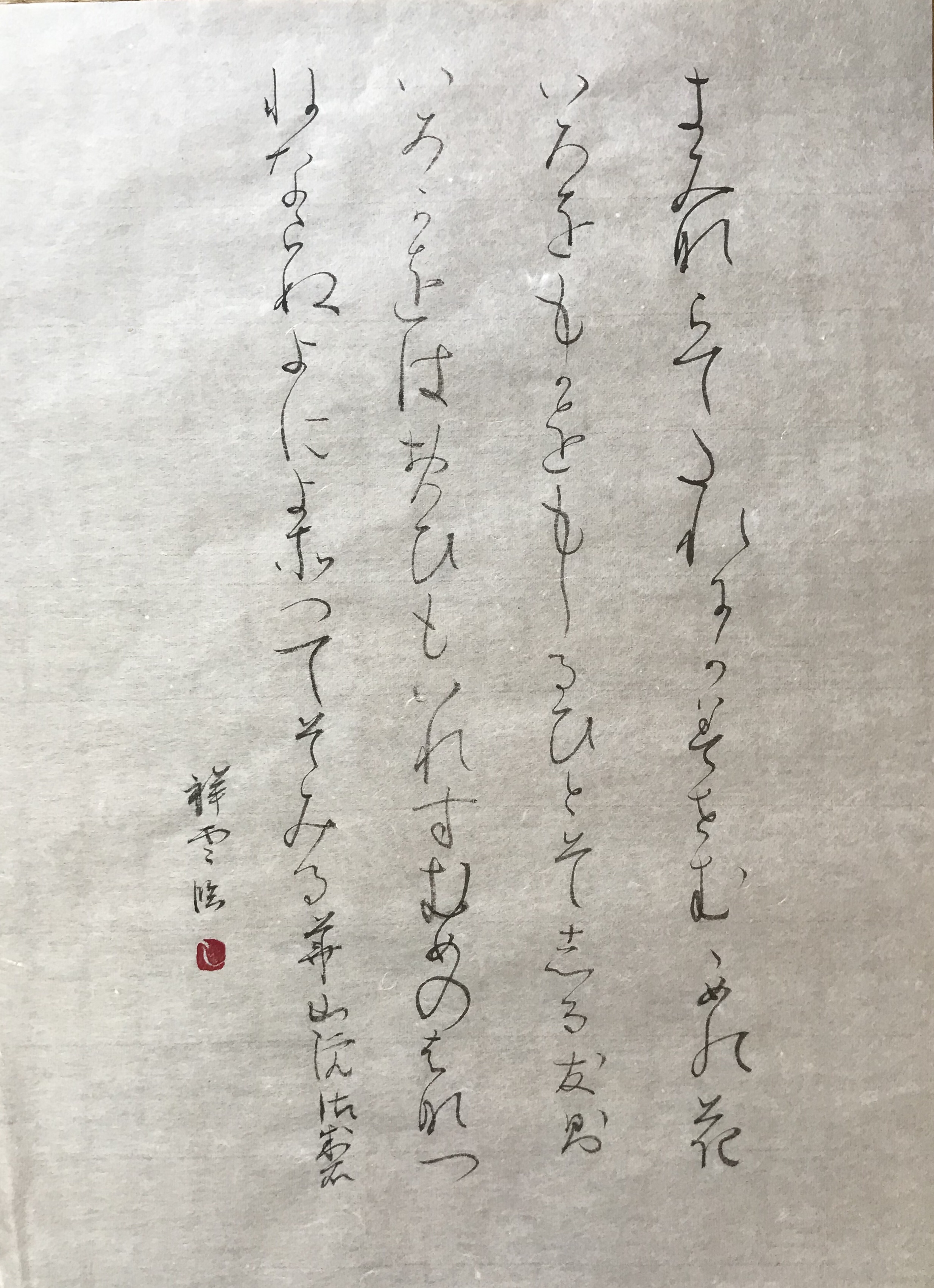 As I learn more shodo I find I understand not only the art of the lettering, but also the poetry. Truth be told, I don’t really concentrate on the meaning of the words as I’m writing; I focus on the lines and the composition. But lately, the poems themselves are hitting me in the heart strings. Below are two poems, waka, from the Wakanroueishu, a collection of a poetic text from the middle Heian Period (around the year 1020). It collects Chinese poems, hanbun, and waka. A friend of mine has posted a book review on a book describing the Heian period, if you are interested.