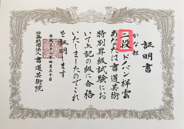 I started Shodo about 4 years ago. I focused mostly on kanji and kana. Surprisingly, I’m progressing in kana more than kanji, which surprised my Sensei as much as me. I just took a level up test, and reached 2nd dan in kana, which is amazing. With kanji, however, I still havent reached 1st dan. But this time, I reached the highest kyu just below dan. my next chance to level up is in September, keeping my fingers crossed.