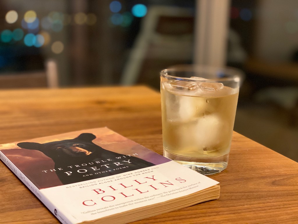 At the end of a long day, later than is good for me, because I should be in bed. I need to be up in the morning. I need my 8 hours. I’m not the whipper snapper I used to be, and I know it. But I want my me time, granddad drink and all, reading Billy Collins poetry and staying up too late.